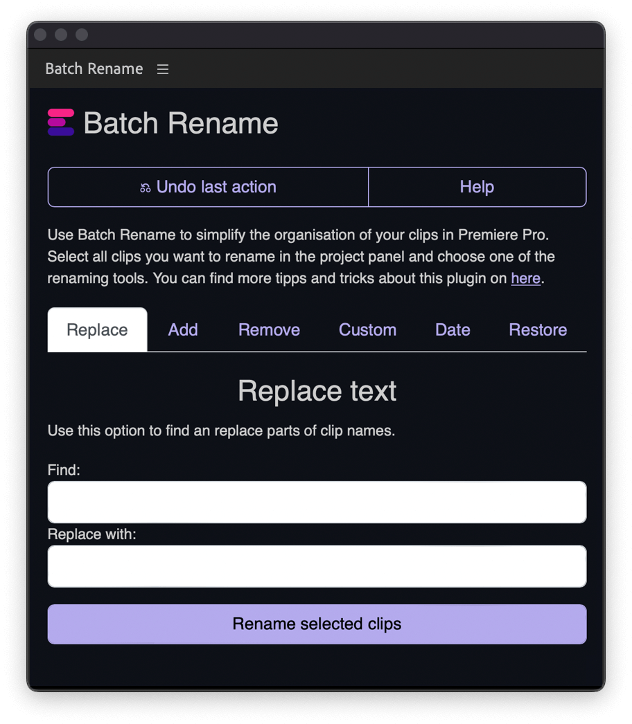 Batch Rename -lisäosa tarjoaa uusia mahdollisuuksia yksinkertaistaa leikkeiden järjestämistä Premiere Prossa. Valitse leikkeesi ja käytä lisäosaa leikkeiden nimeämiseen eräajona nopeammin. Korvaa sanoja lähdetiedostoissa tai lisää päivämääriä ja mukautettua tekstiä leikkeiden nimiin. Lisäosa tarjoaa lisää vaihtoehtoja suurten Premiere Pro -tuotantojen optimointiin. Optimoitu avustavien leikkaajien tarpeisiin.