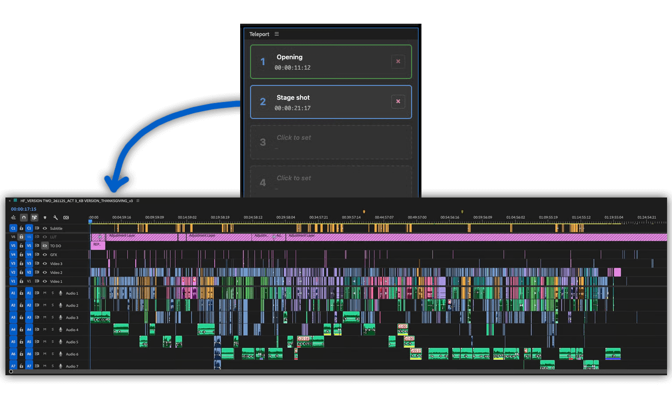 Teleport lets you drop a digital anchor anywhere in your timeline, allowing you to instantly jump back to that exact frame. No more searching for colored markers or memorizing timecodes!