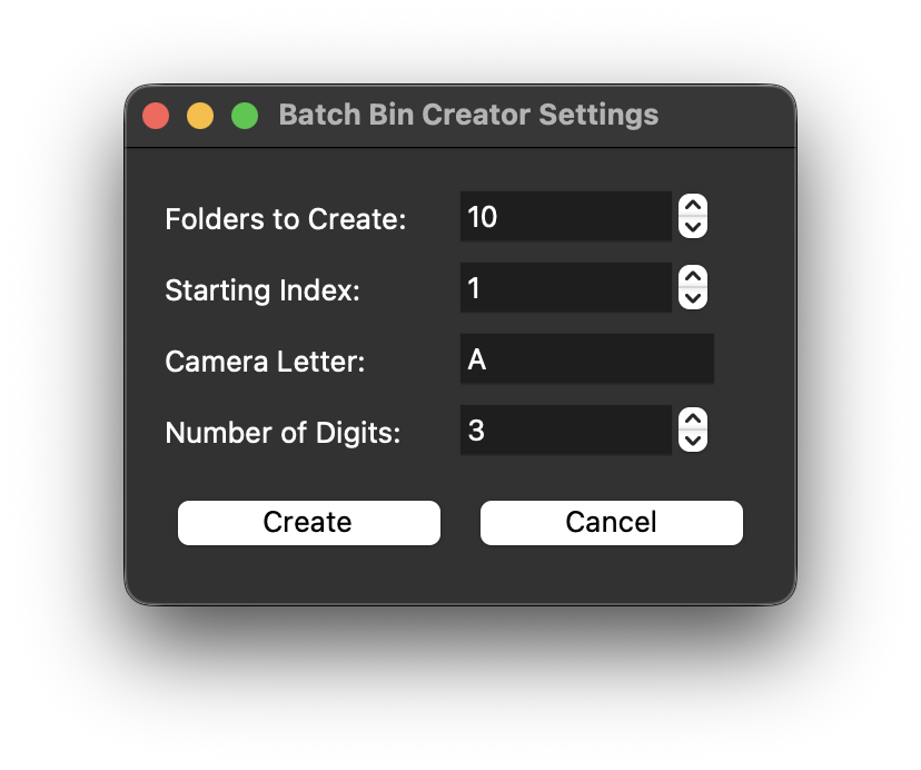 4. In the dialog, set how many bins to create, the starting number, camera letter and amount of digits.