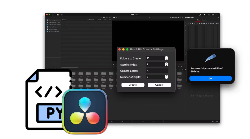 This script generates camera roll-style bins inside the DaVinci Resolve Media Pool using a simple dialog. It allows assistant editors and DITs to quickly create structured bin hierarchies like: A001, A002, A003. Perfect for on-set dailies organization, postproduction prep, or DIT workflows, where naming consistency and speed are critical.